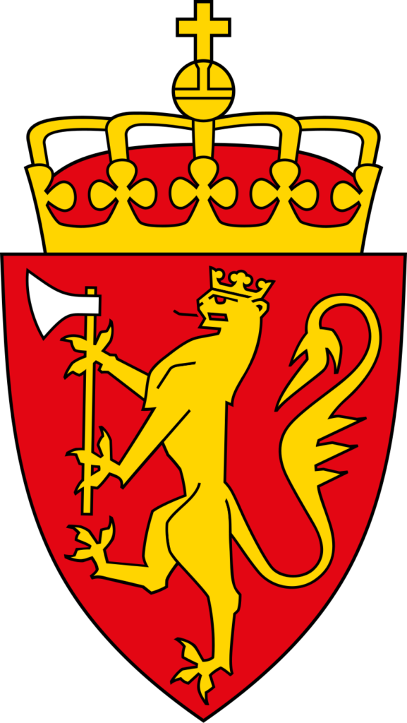 The coat of arms of the state of Norway, is composed of a Golden lion, tongue and crown, holding an axe, with the red background. It is the coat of arms of the Norwegian royal family.